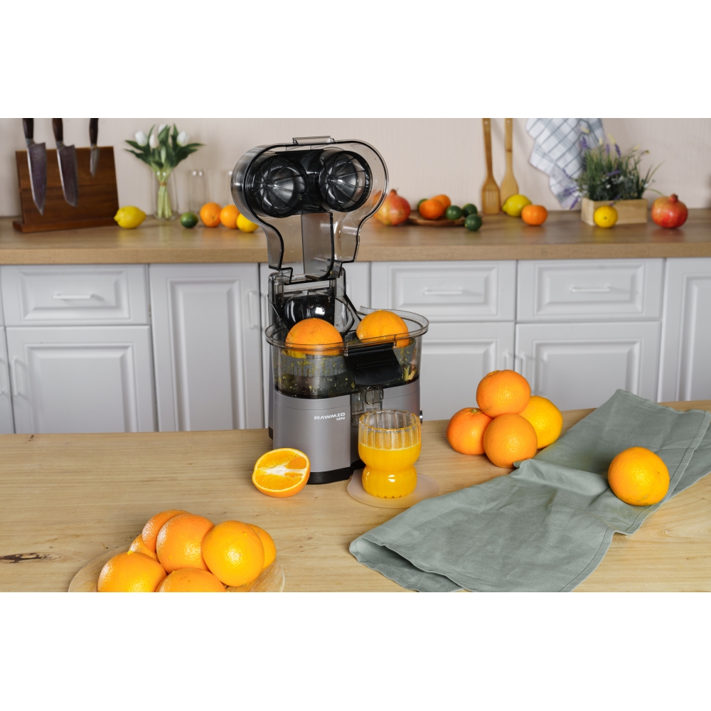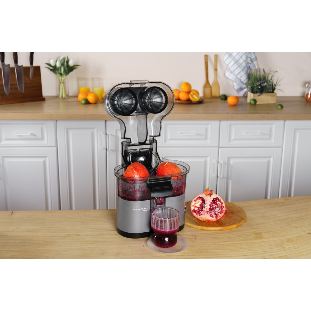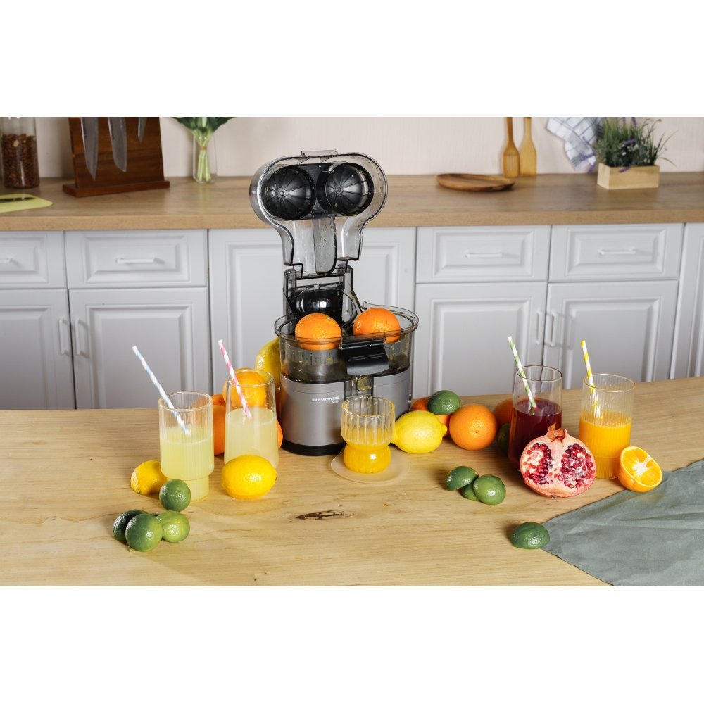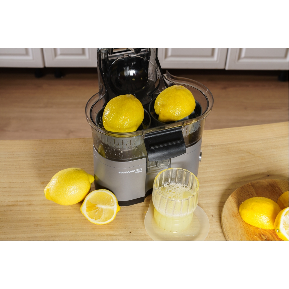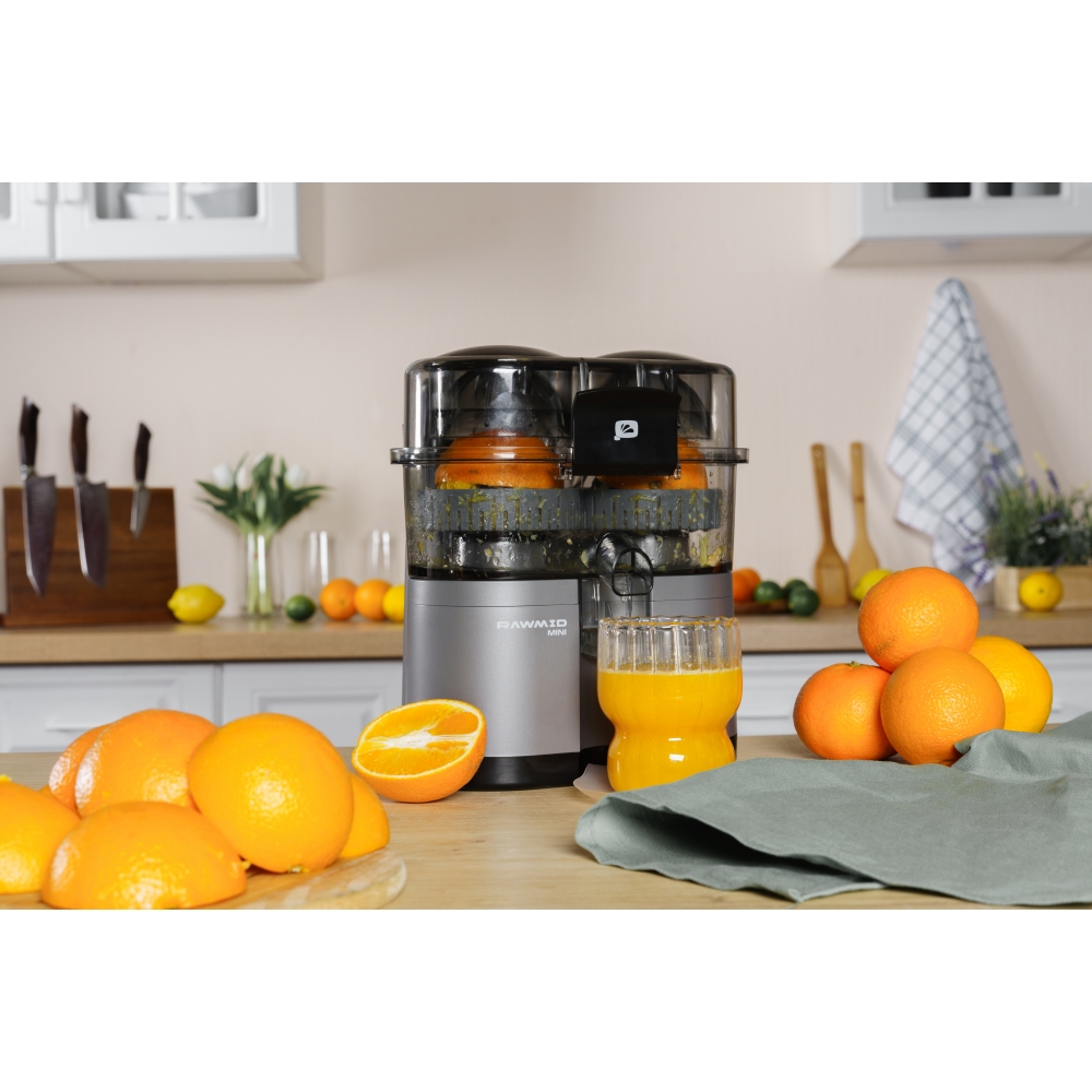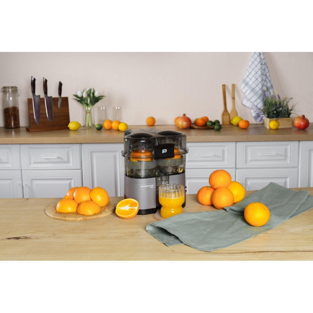 В отличие от большинства моделей, где необходимо удерживать фрукт руками, RAWMID Mini RMJ-02 полностью автоматизирует процесс: встроенный пресс поднимает двойной конус и прижимает половинки фрукта к крышке, извлекая максимум сока. Просто нажмите кнопку — всё остальное прибор сделает сам!