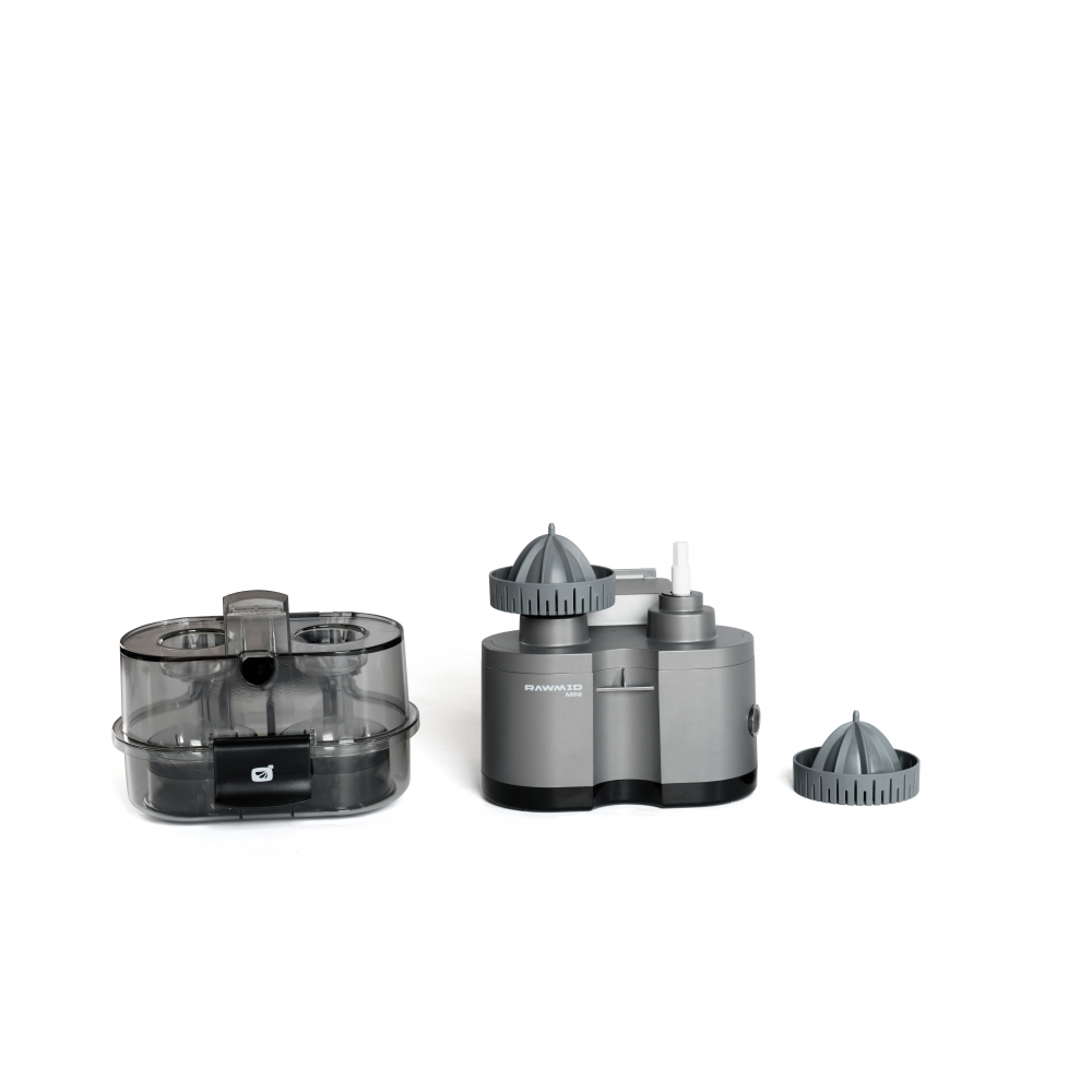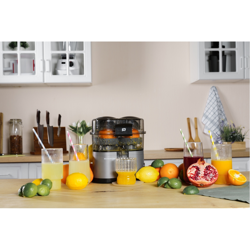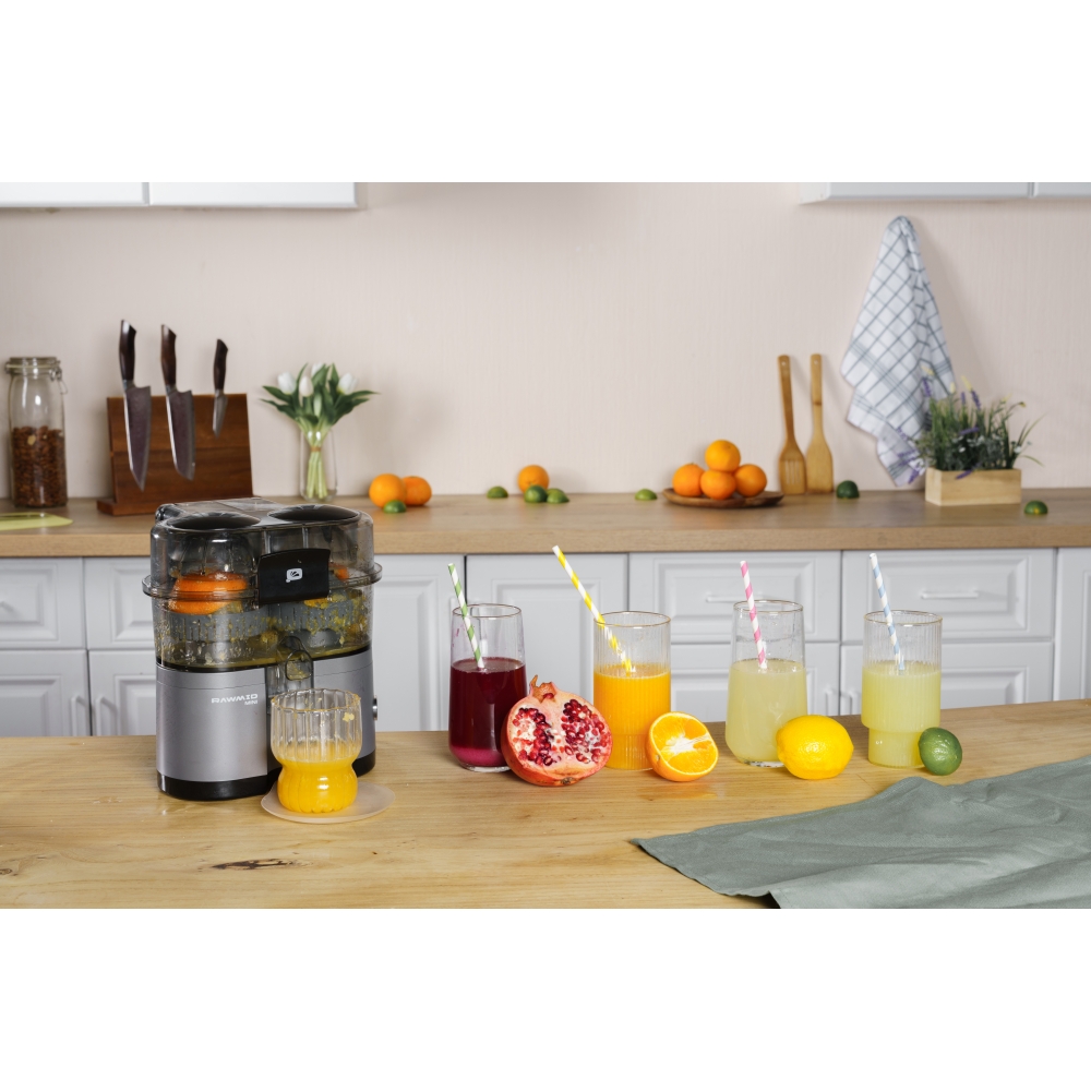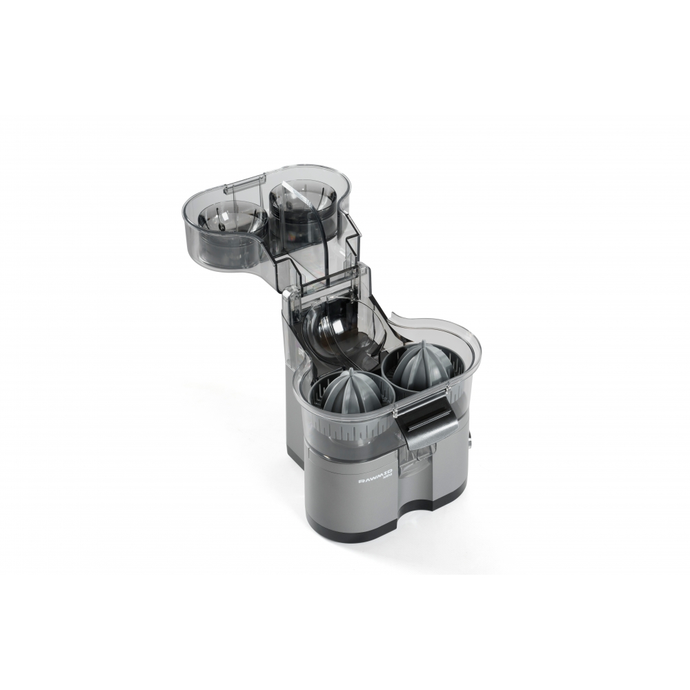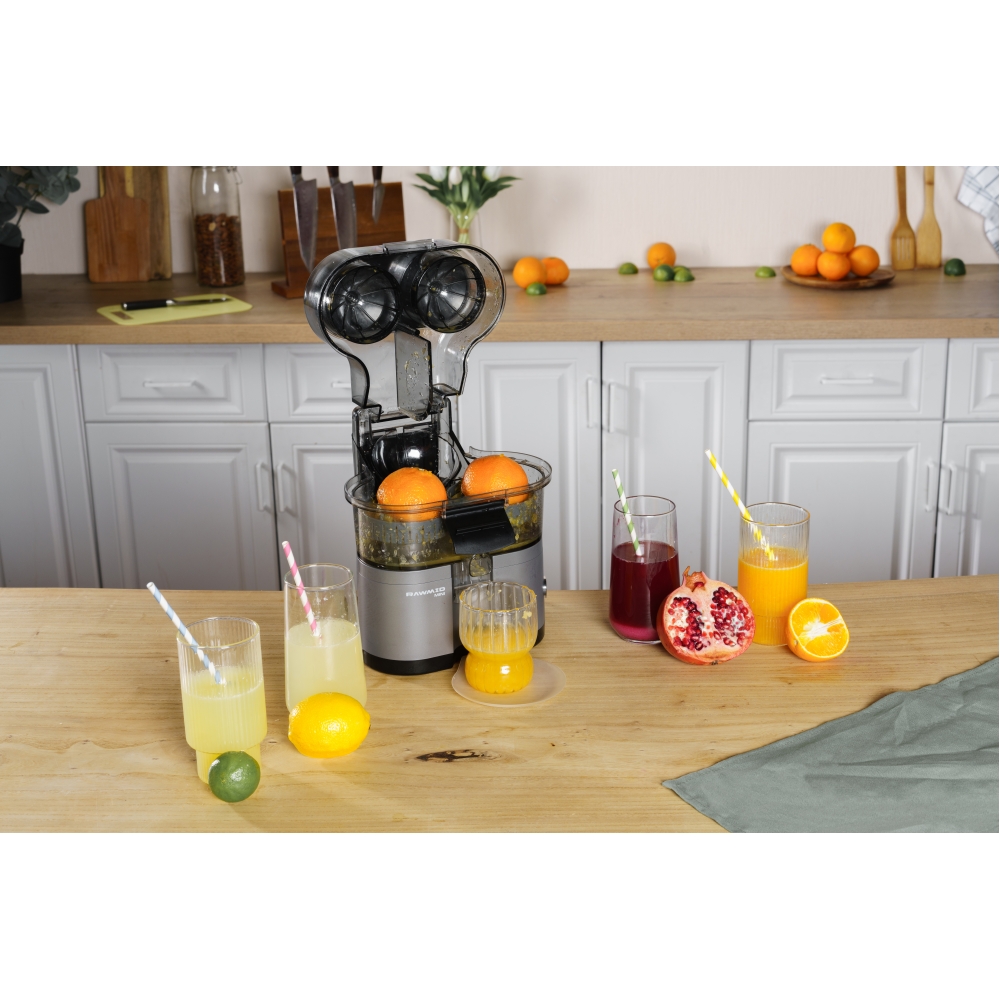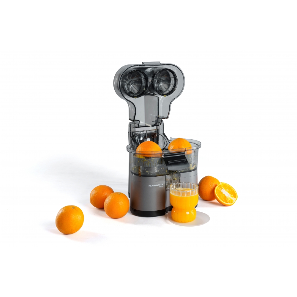 В отличие от большинства моделей, где необходимо удерживать фрукт руками, RAWMID Mini RMJ-02 полностью автоматизирует процесс: встроенный пресс поднимает двойной конус и прижимает половинки фрукта к крышке, извлекая максимум сока. Просто нажмите кнопку — всё остальное прибор сделает сам!