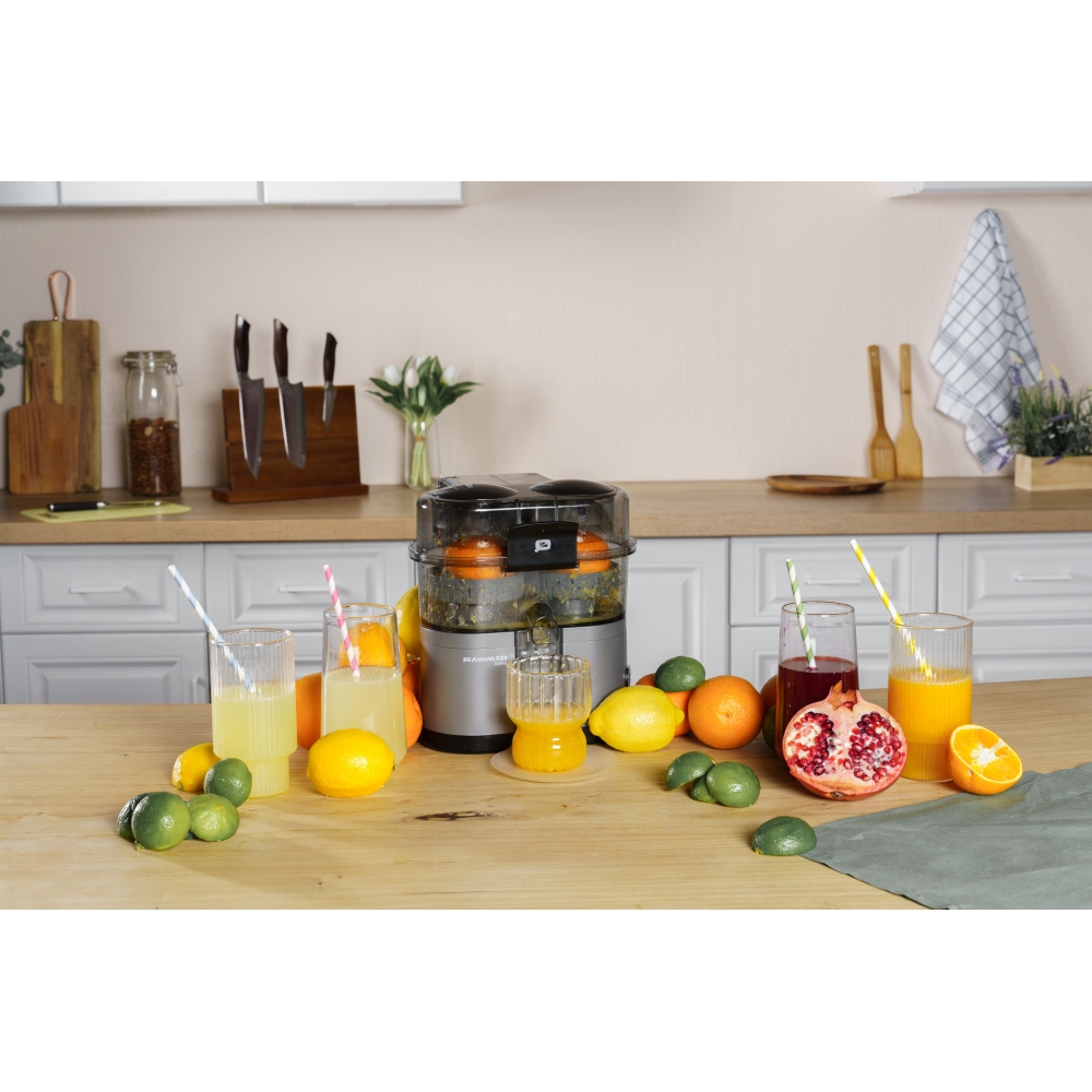 Две насадки работают синхронно: выжимают сок одновременно из двух половинок фрукта, ускоряя процесс в два раза. Идеально для лимонов, апельсинов, лаймов, мандаринов и даже гранатов!