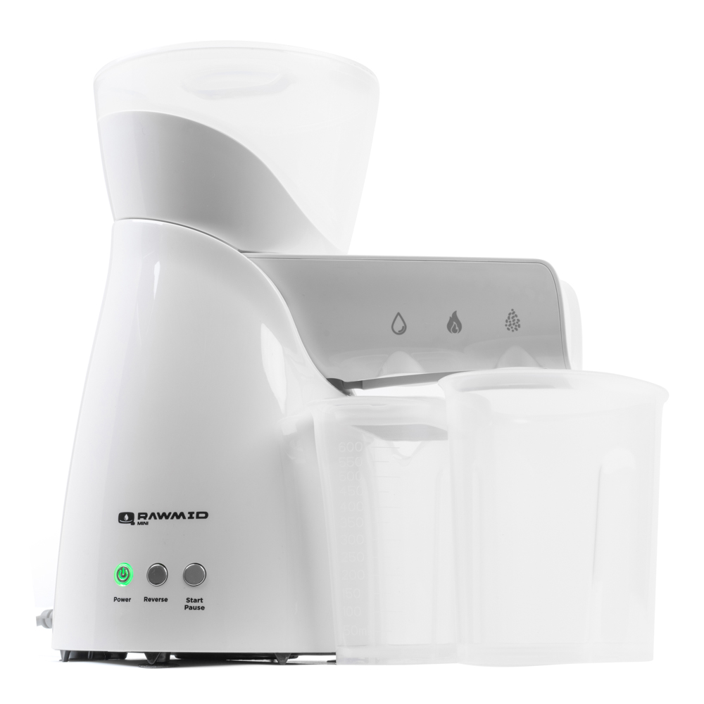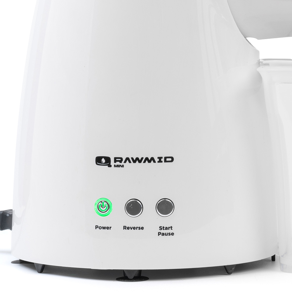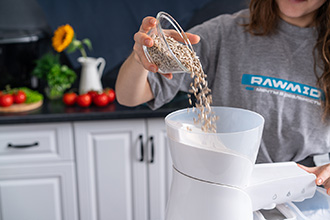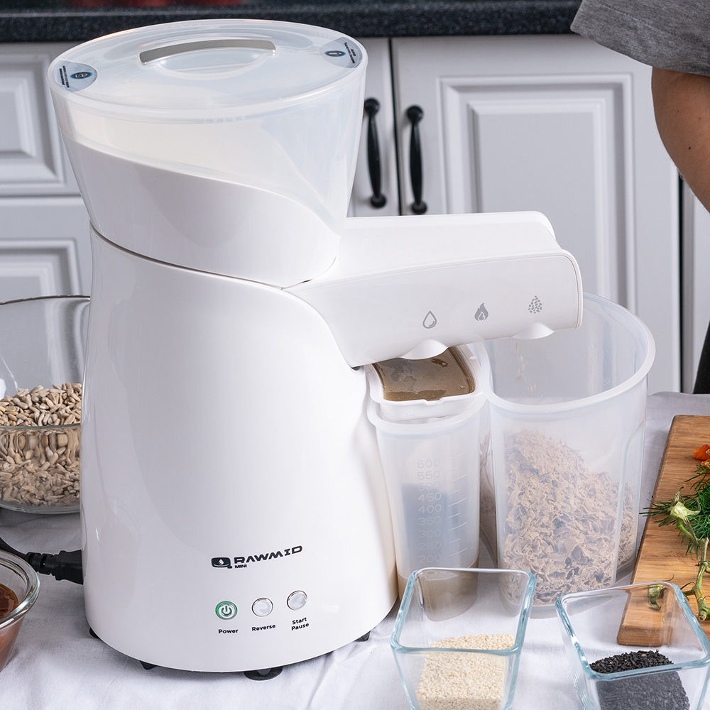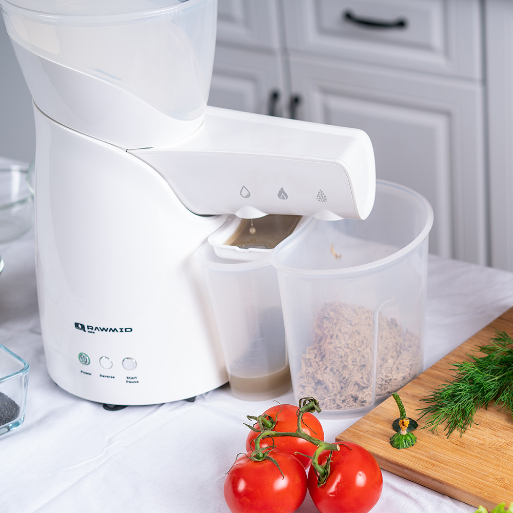 Маслопресс RAWMID Mini требует минимального участия владельца в процессе отжима масла. Нужно лишь загрузить сырьё в загрузочный бункер, закрыть крышку и включить прибор. Жмых и масло будут падать в подставленные контейнеры, при этом на контейнер для масла устанавливается сетчатый фильтр, отсеивающий частицы жмыха. Когда сырьё закончится и перестанет поступать в помольную камеру, маслопресс автоматически выключится.