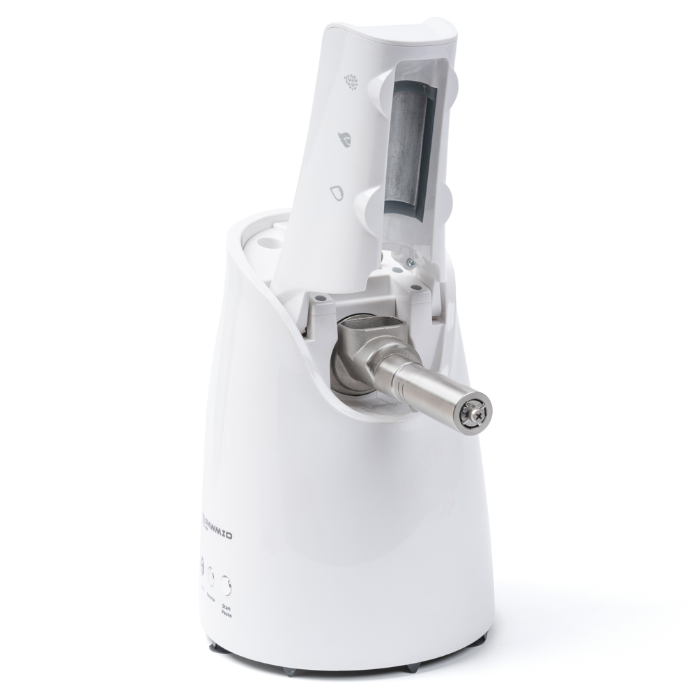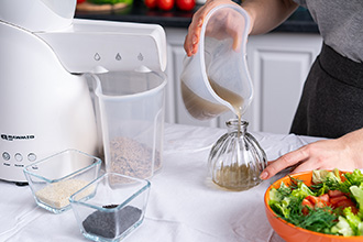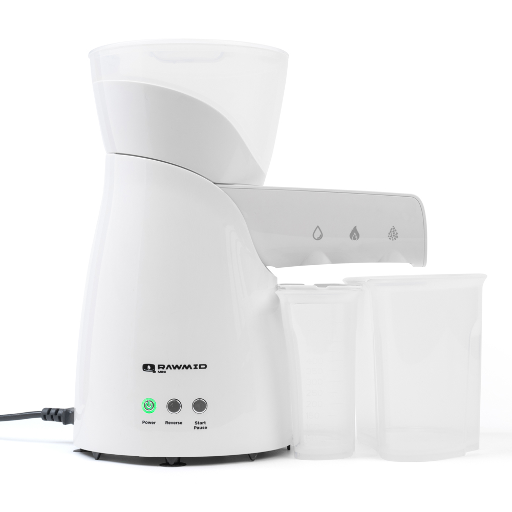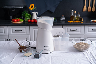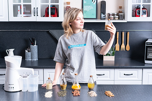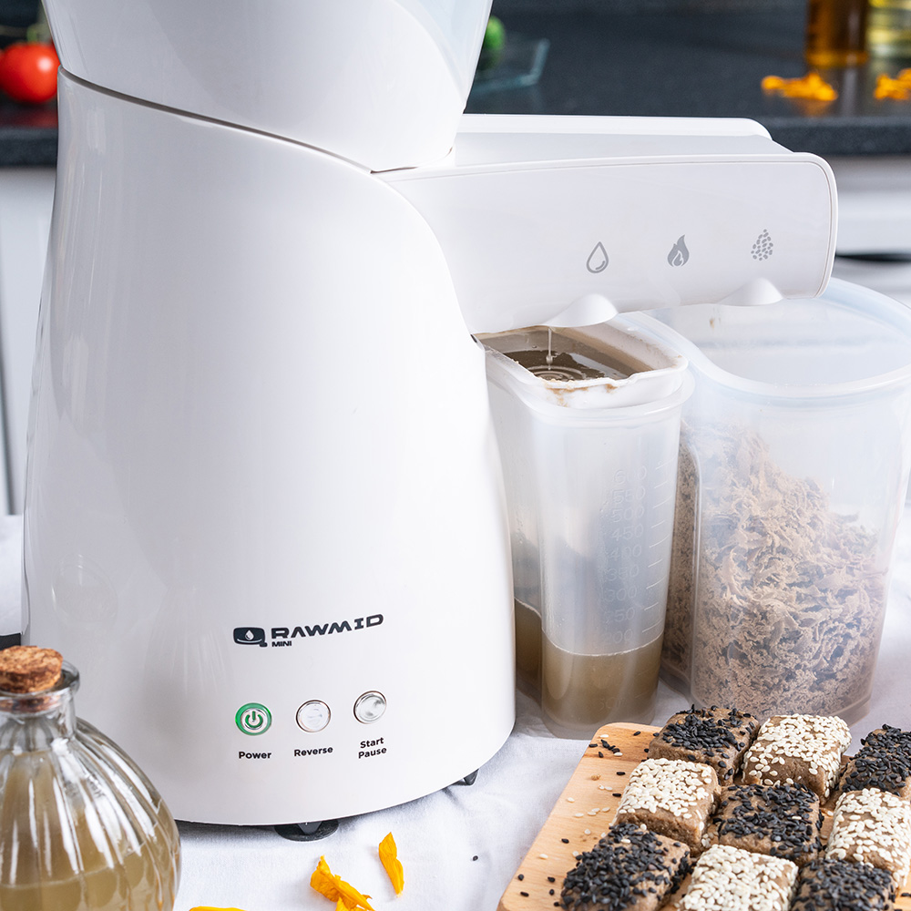 Маслопресс RAWMID Mini требует минимального участия владельца в процессе отжима масла. Нужно лишь загрузить сырьё в загрузочный бункер, закрыть крышку и включить прибор. Жмых и масло будут падать в подставленные контейнеры, при этом на контейнер для масла устанавливается сетчатый фильтр, отсеивающий частицы жмыха. Когда сырьё закончится и перестанет поступать в помольную камеру, маслопресс автоматически выключится.