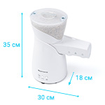 Габариты устройства составляют всего лишь 18×35×30 см, что позволяет компактно размещать его во время работы на столе и столь же удобно и компактно хранить в шкафу. Дополнительное удобство придаётся тем, что один контейнер вкладывается в другой, что также экономит пространство.