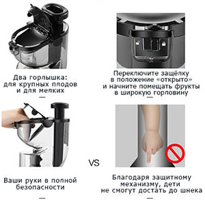 Низкие обороты шнека (38 об/мин) обеспечивают эффективный, но в то же время бережный отжим – без нагрева и сильного окисления продуктов. Это позволяет сохранить в свежевыжатых соках максимальное количество полезных веществ – витаминов, энзимов и антиоксидантов.