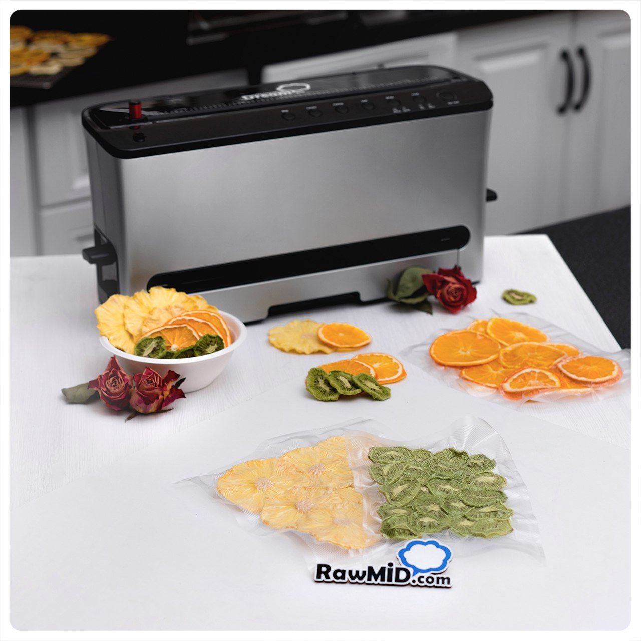Получите профессиональный вакууматор RawMid Dream Pro и приступайте к вакуумированию продуктов сразу же, без покупки дополнительных материалов!