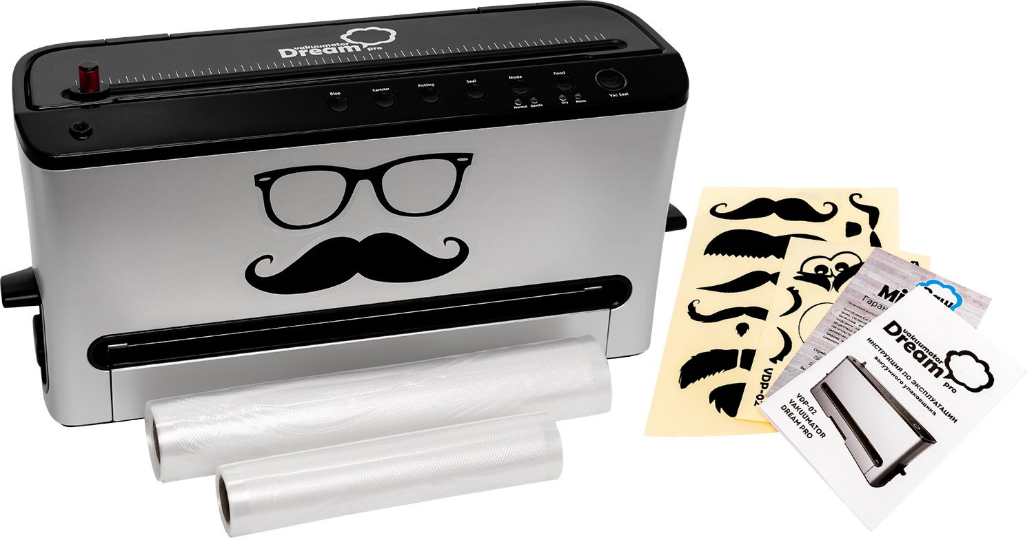 При заказе промышленного вакууматора Dream Pro вы получаете полный комплект для вакуумирования продуктов: рулон пищевой плёнки, специальные упаковочные пакеты, шланг для откачивания воздуха. Кроме того, в комплекте набор наклеек и подробная инструкция на русском языке.